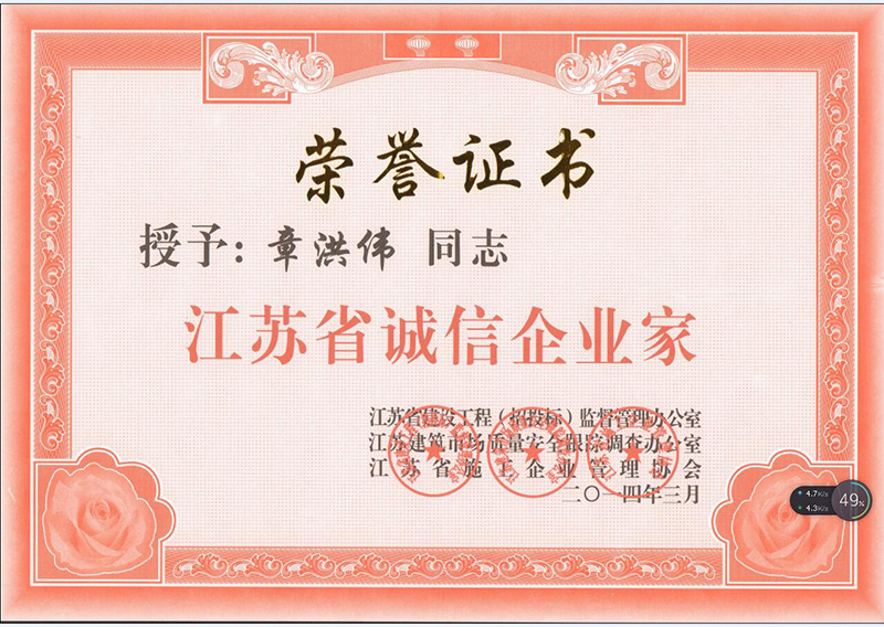 2014年誠信企業家榮譽證書